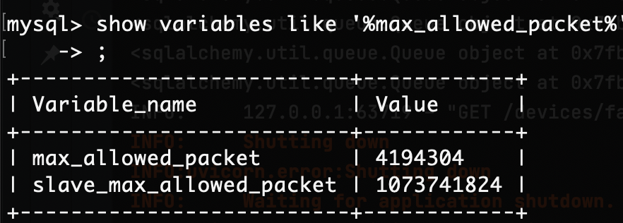 c-2) 패킷 전송에 문제가 있는 경우 : Mysql의 max_allowed_packet값을 초과할 경우 발생(한 쿼리에 전송되는 데이터양)