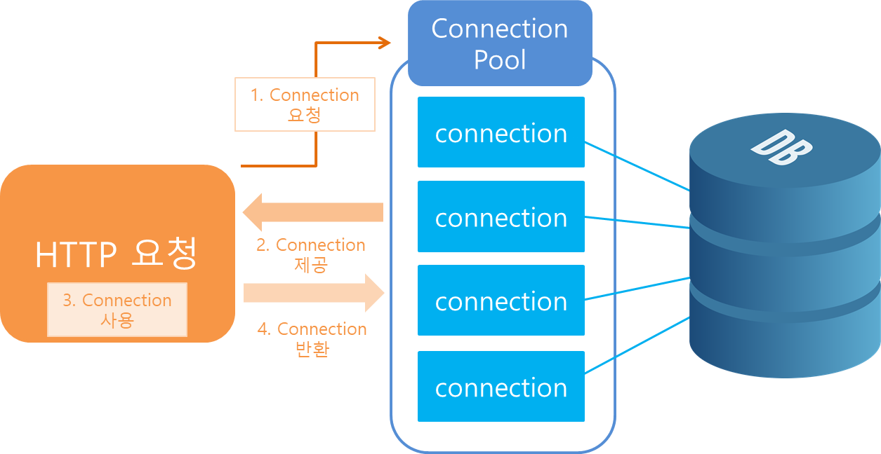 이러한 상황을 방지하기 위해 미리 일정수의 Connection을 만들어 Pool 에 담아뒀다가 사용자의 요청이 발생하면 연결을 해주고 연결 종료 시 Pool 에 다시 반환하여 보관하는 것이다.
