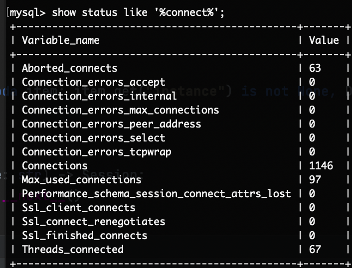 Connection Usage(%) = Threads_connected / max_connections * 100 = (64 / 1000) * 100 = 6.4%