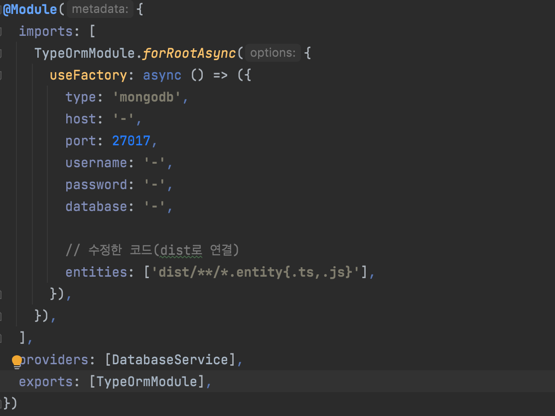 - TypeORM Module Configuration의 entities 설정 path를 다음과 같이 수정하세요.