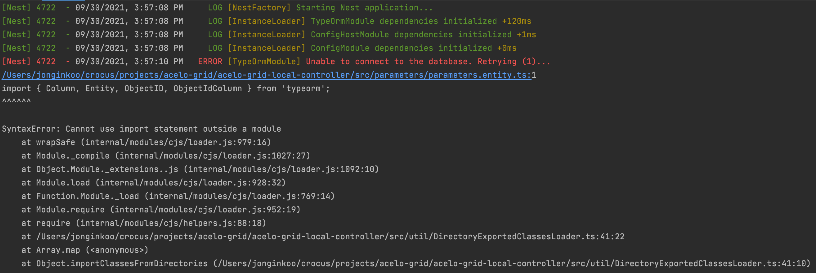 TypeORM Entity in NESTJS - Cannot use import statement outside a module