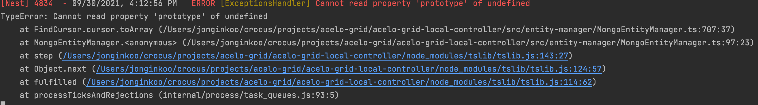 entities: ['../**/*.entity.{ts,js}'] - The error you are getting is because you are attempting to import a ts file in a js context. So long as you aren't using webpack you can use this instead so that you get the correct files (가져오는 오류는 js 컨텍스트에서 ts 파일을 가져오려고 하기 때문입니다. webpack을 사용하지 않는 한 올바른 파일을 얻기 위해 이것을 대신 사용할 수 있습니다.)